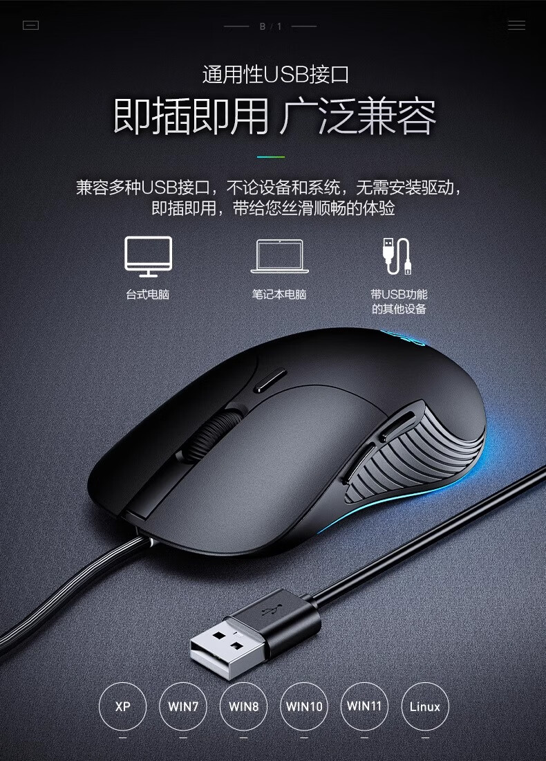 英菲克(INPHIC)B1有线鼠标静音办公台式机电脑游戏宏电竞男USB